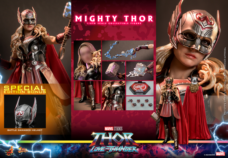 配件包含佈滿裂痕的雷神之鎚(搭載 LED 發光功能)、雷電特效、多個替換手,以及《愛與雷霆》主題的展示底座;另外,Hot Toys 也同步發行了追加有戰損頭盔的特別版本喔。