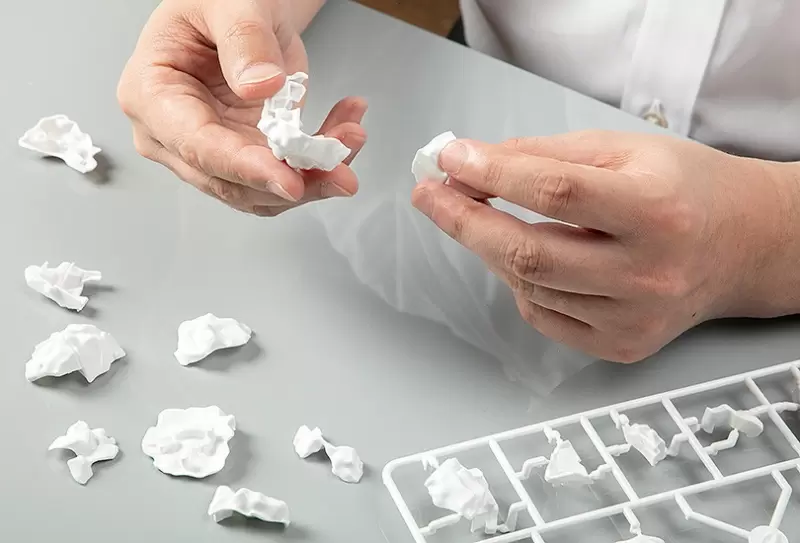 「垃圾」1/1 比例組裝模型,為秋東精工與株式会社無駄合作企劃的第一彈商品,以書桌上常見的紙團垃圾為主角,透過組裝零件還原白紙被揉捏成球狀的造型,採用為100%使用再生材質打造,既是環保組裝套件也是垃圾。共能組出兩顆垃圾,商品不附說明書,讓人能以拼圖的感覺細細體驗垃圾的細節!組裝後不用再加以塗裝就有非常高的完成度,放在垃圾桶旁邊或放在垃圾桶裡賞玩,別有一番風味~