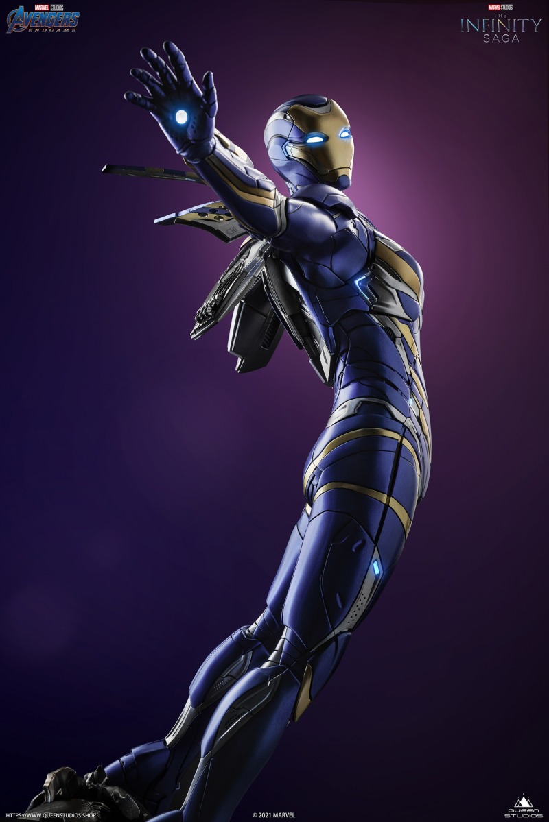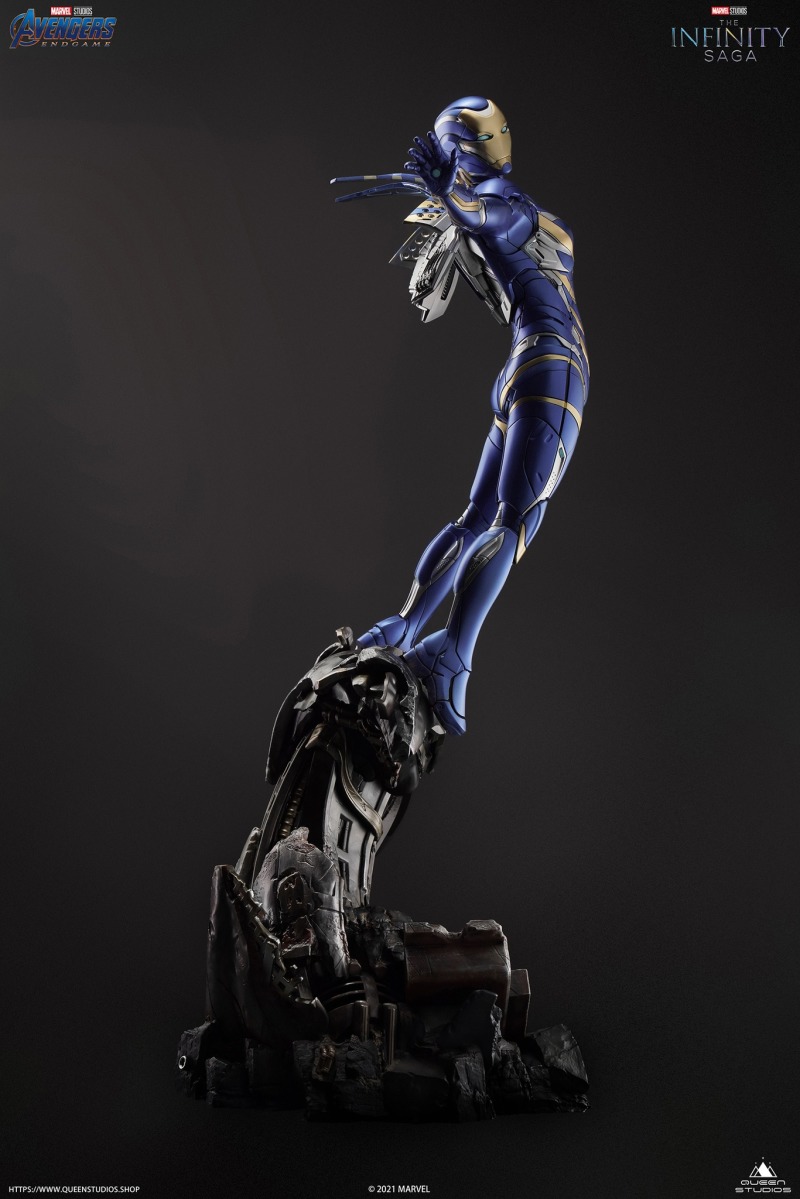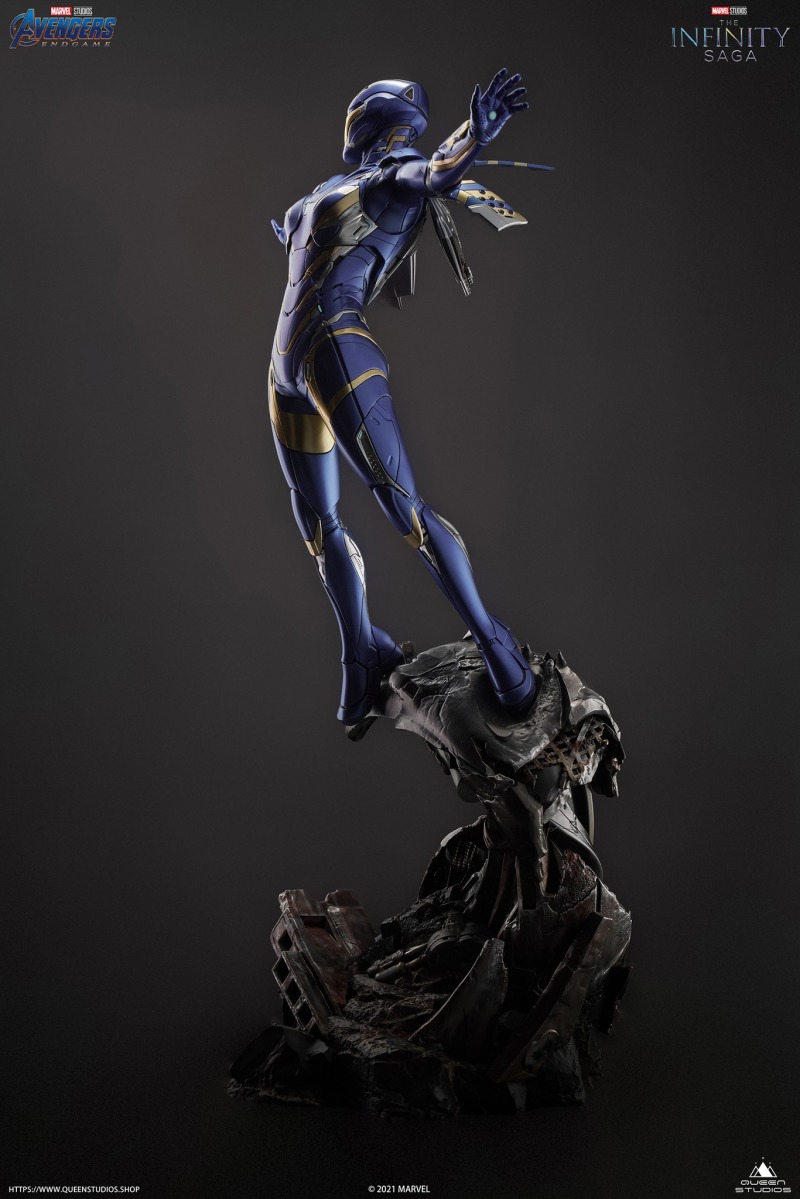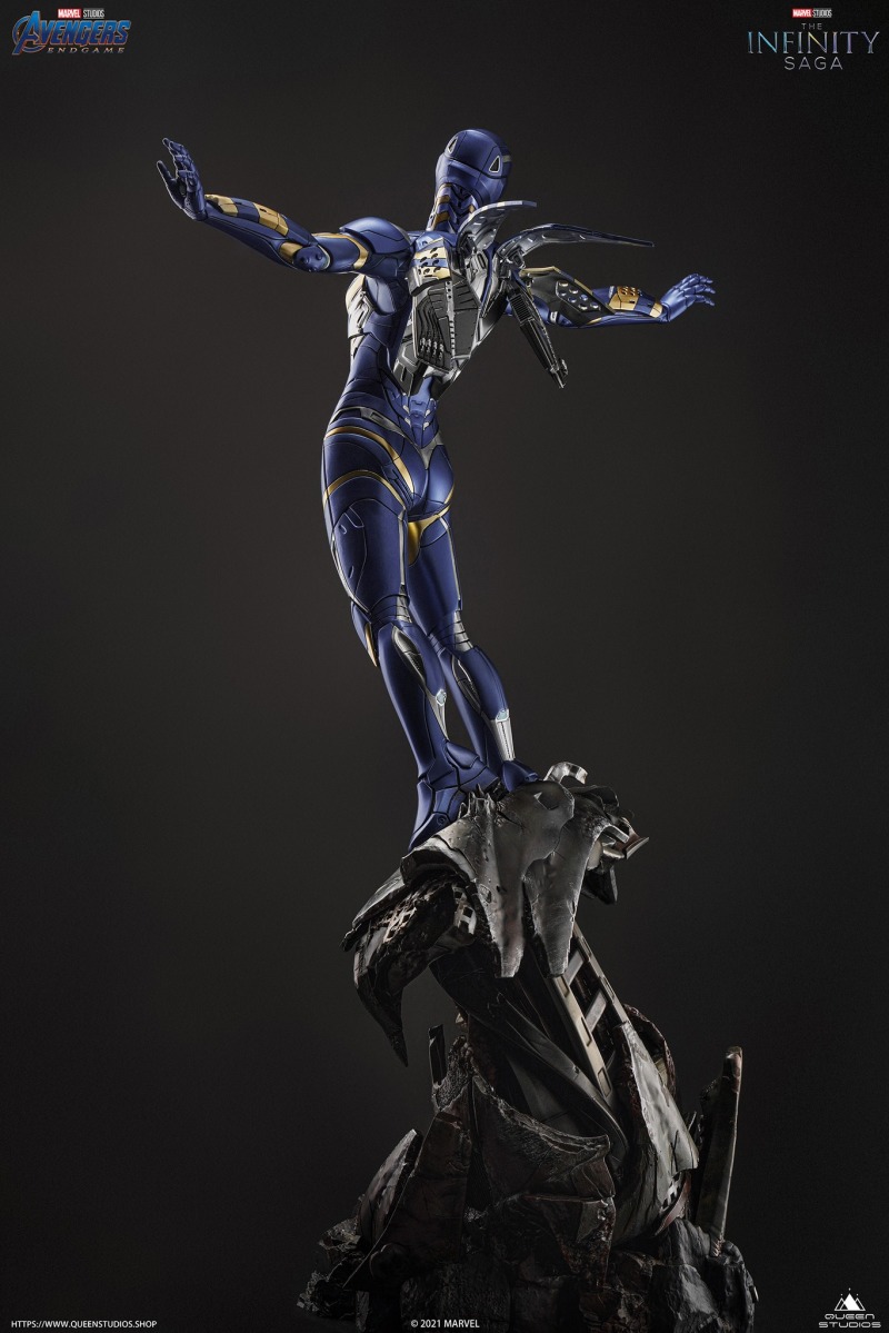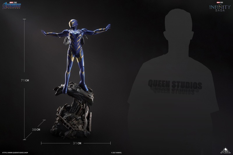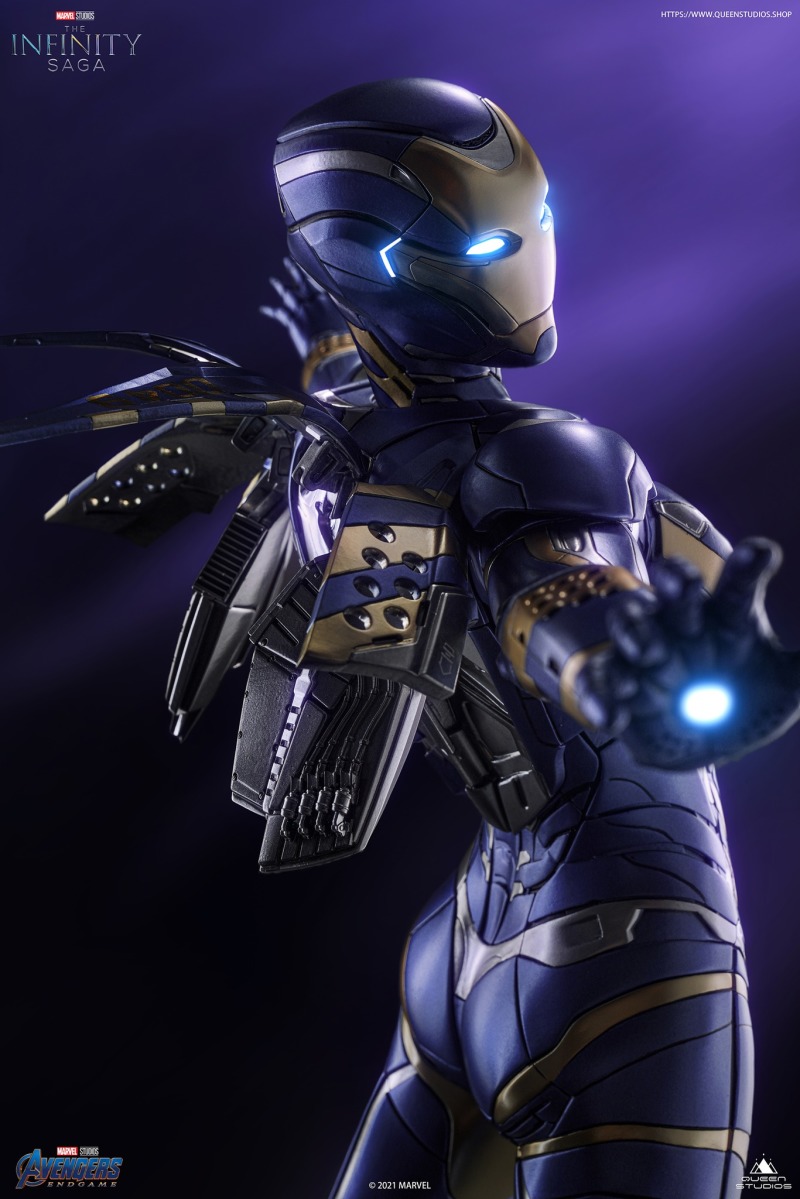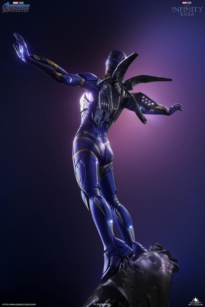 本次以獨立形式推出的「鋼鐵人馬克 85」與「救援裝甲」,高度分別為 64、71 公分,充分再現了《終局之戰》末段夫妻攜手作戰的魄力場面,細膩形塑出肌肉線條的鋼鐵裝甲、精密機械結構與大量刻線,與救援裝甲身後正處於展開狀態的定風翼皆施以高度造型力,加上頭部雙眼、胸口反應爐、雙手掌心......等處的 LED 發光功能,點亮之後更具臨場感!底座部分是以大戰當中的斷垣殘壁為題設計,在表現出逼真質地的同時,也盡可能拉抬了雕像本體與地面的高度,使其更具空中作戰的視覺效果。