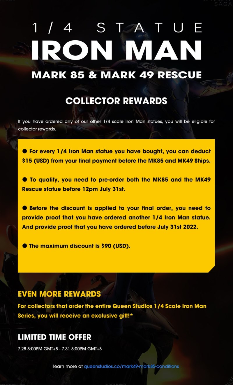 擅長以大比例雕像表現角色魅力、重現逼真細節的造型廠牌 Queen Studios 於昨(28)日正式發表了《復仇者聯盟:終局之戰》的「鋼鐵人馬克 85」與馬克 49「救援裝甲」1/4 比例全身雕像開放預訂的消息!兩款分別限量 750 體,預計 2023 年第四季發貨。