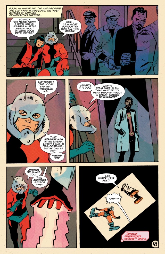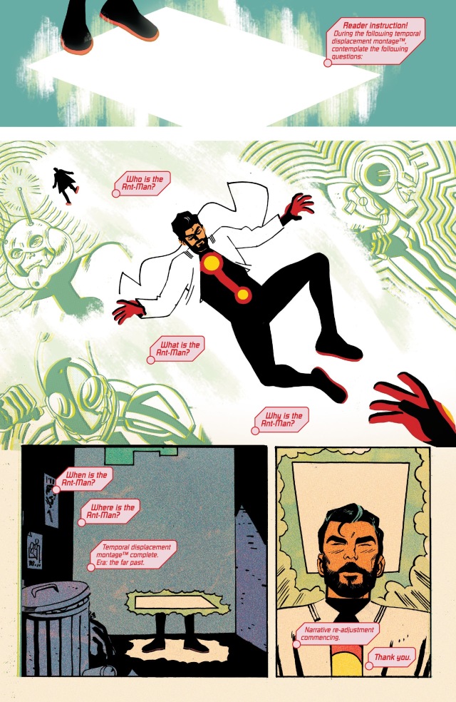 為了某些不知名的理由,他透過時間機器穿越回到了白銀時代的蟻人漫畫當中。順帶一提,在時間流中出現的三個人影分別就是目前出現過的三代蟻人:左上的漢克‧皮姆(Hank Pym)、右上的史考特‧朗(Scott Lang)以及左下的艾瑞克‧歐葛雷迪(Eric O'Grady)。