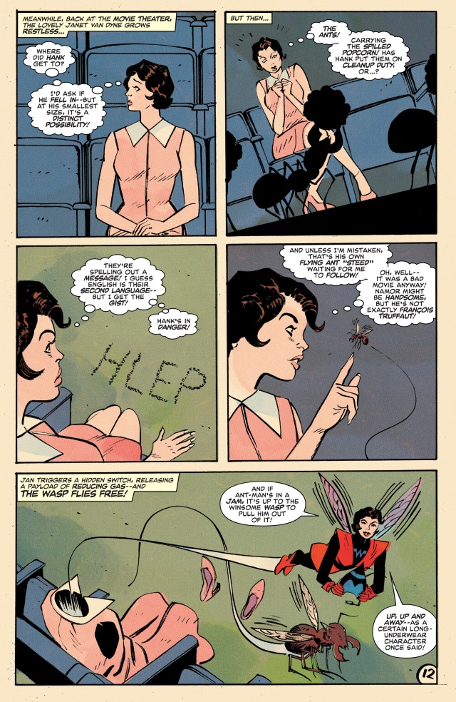 在現在仍然待在電影院裡面的珍妮特還在想說漢克到底跑到哪裏去了,結果地上的螞蟻拿起剛才艾瑞克丟的爆米花排成了「救命」(還拼錯),於是她連忙縮小前去救援。