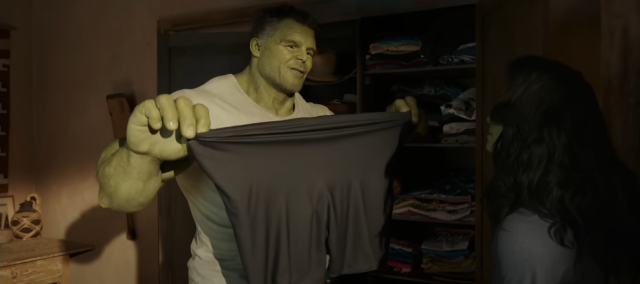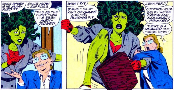 在最新預告中,「女浩克」表現出了打破第四道牆的能力與觀眾對話。 雖然在現代「死侍」才是漫威觀眾印象深刻的「打破第四道牆」代表性人物,但首次登場於1980年的女浩克,早在1991年死侍初登場前,就已經有了打破第四道牆的先例。