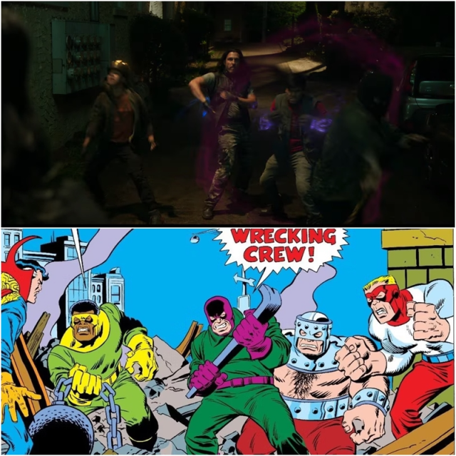 這群在街頭挑釁女浩克的超能力犯罪者,很可能是漫畫中的「拆解小隊」(Wrecking Crew)。 這是一支於捍衛者聯盟(漫畫中是由奇異博士、浩克、納摩與銀色衝浪手等人組成)登場的主要反派。 首次登場於 1974年《捍衛者聯盟》第17期,原本是一群普通的罪犯,某一次闖入酒店搶劫,不料卻遇到了洛基,當時洛基正在召喚可以擊敗索爾的神秘力量,陰錯陽差下轉嫁到他們身上,讓他們獲得意外的超能力。