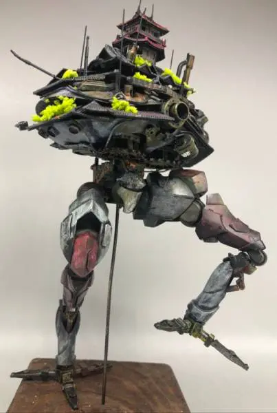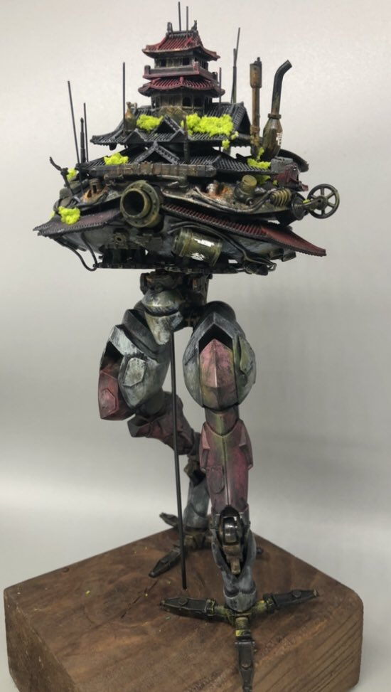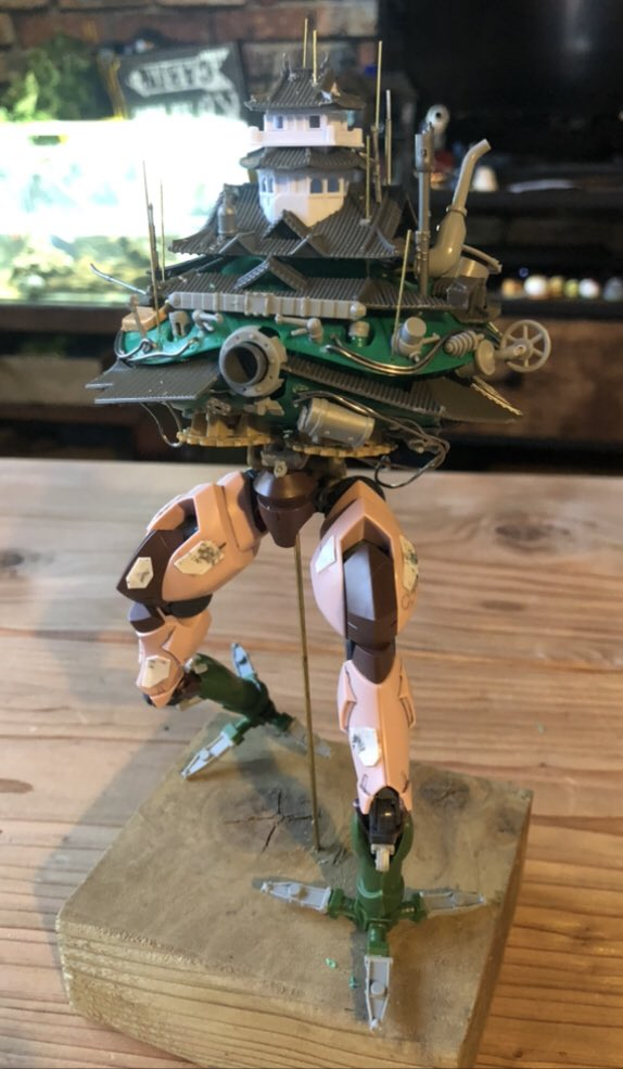 推主採用早期萬代推出的 1/550 的畢格薩姆組裝模型為基礎改造,而上頭的日本城使用號稱「天下布武」之城,安土時代織田信長的居城「安土城」的組裝模型結合,打造出結合日式城堡風味的畢格薩姆。