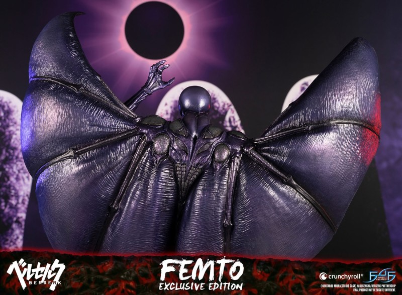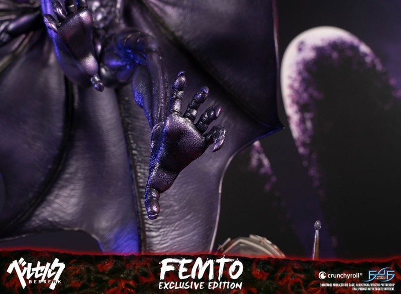 「First 4 Figures 烙印勇士 費蒙特」全身場景雕像,以費姆特從霸王之卵誕生的經典場景為設計,尺寸高 68.5公分、寬 57 公分,精緻地打造出費姆特複雜的肌肉線條與遍布身軀的皮革紋理,身後披風般的黑雙翼、手爪等處刻劃有骨骼結構;施以油亮感的塗裝讓整體更具生物感。底座被痛苦的臉填滿,營造出血腥而真實的質感,令人想起劇中場景。