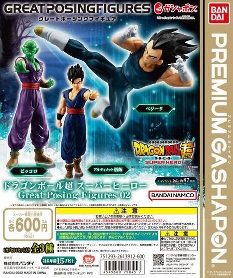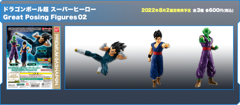 「七龍珠超 超級英雄 Great Posing Figures02」轉蛋,以約 75 mm 的份量尺寸搭配充滿躍動感的姿勢為主打,收錄了在劇場版中新服裝的貝吉塔、終極悟飯、比克,不僅在造型上有細膩的刻畫,塗裝方面也有精細的表現,再加上令人注目的動作,喜歡轉蛋尺寸精巧模型的玩家可以考慮收藏!