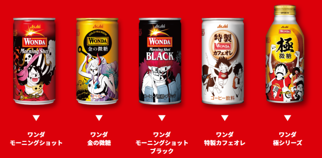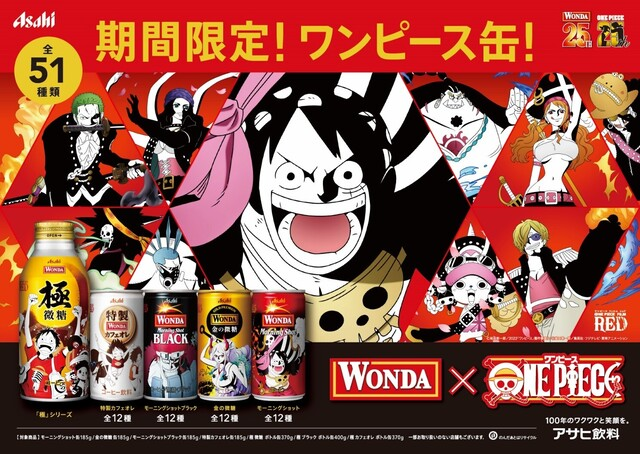 日本 Asahi 朝日公司旗下的罐裝咖啡品牌「WONDA」咖啡,先前與《烏龍派出所》及《進擊的巨人》合作推出限定聯名包裝。這次再攜手與劇場版電影《ONE PIECE FILM RED》熱賣的《航海王》一同推出聯名包裝,包裝款式有 51 種!已陸續在日本超商超市等通路上架販售。