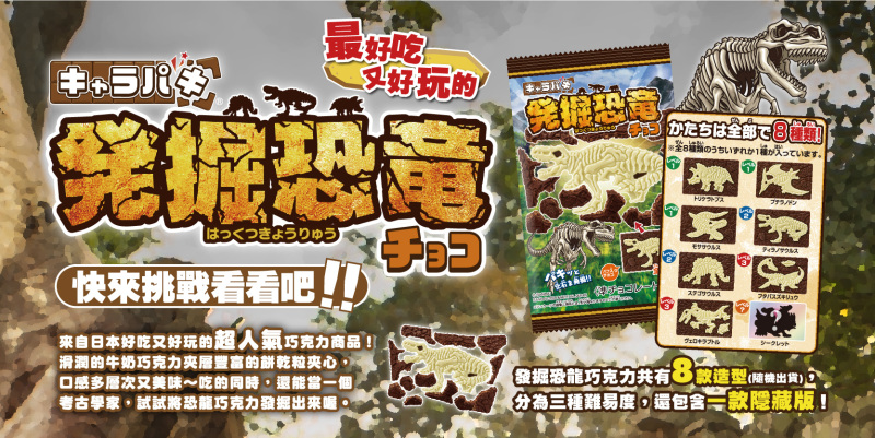 主打能邊吃邊玩、享受考古樂趣的「萬代 發掘恐龍巧克力風味糖」,以多層次口感的滑潤牛奶巧克力夾層、豐富餅乾粒夾心為主體,並在其中設計有白巧克力的恐龍化石造型,收錄有:暴龍、三角龍、無齒翼龍、劍龍、雙葉龍、伶盜龍、滄龍、超帥的隱藏版等 8 款人氣恐龍!