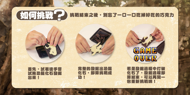 根據不同造型的恐龍化石,總共有三種難易度;透過手或是各種創意小道具,將白色的恐龍巧克力完整取出就算挖掘挑戰成功!但如果發掘過程中不小心把化石敲破,發掘過程就結束啦~請再開一包重新挑戰吧!
