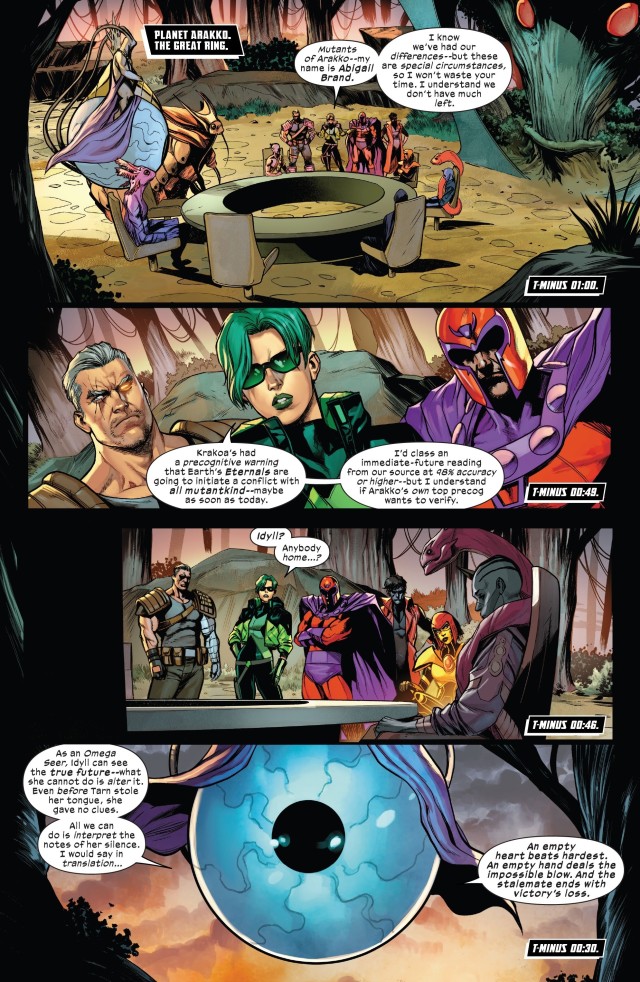 首先,萬磁王(Magneto)、阿比蓋爾‧布蘭德(Abigail Brand)、鎖鏈(Cable)與夜行者(Nightcrawler)來到阿拉科的巨輪議會(The Great Ring)告知他們命運女(Destiny)所做出永恆族即將襲來的預言,並向這邊的奧米加級先知,僵局之席的Idyll詢問狀況。