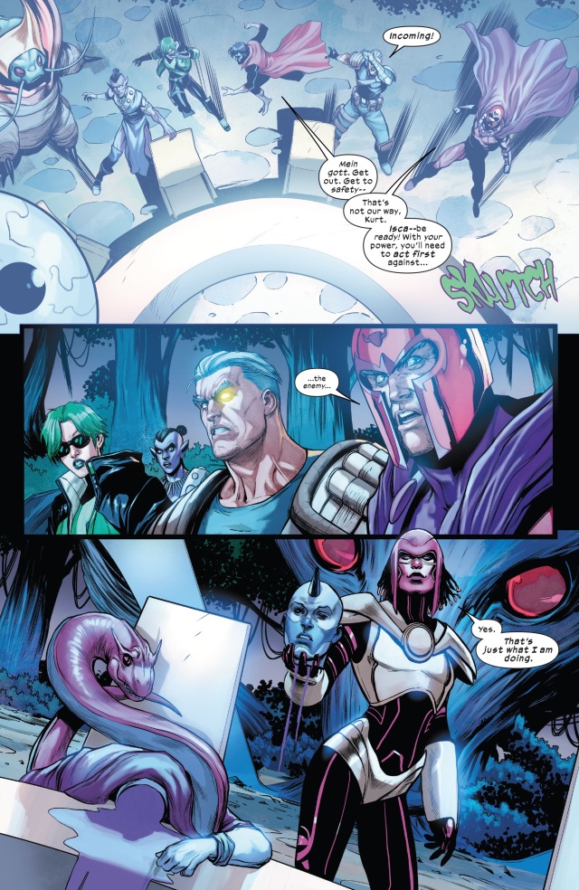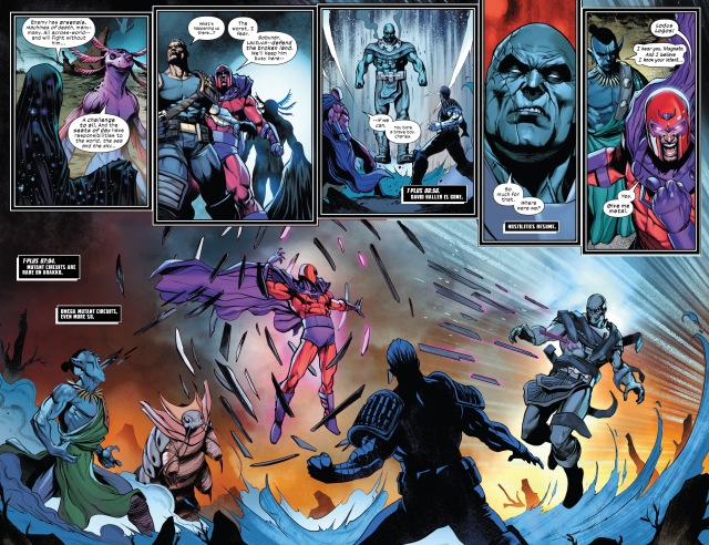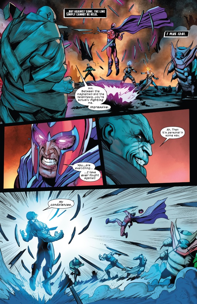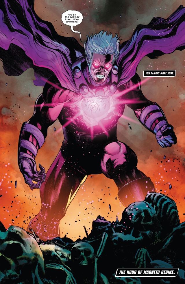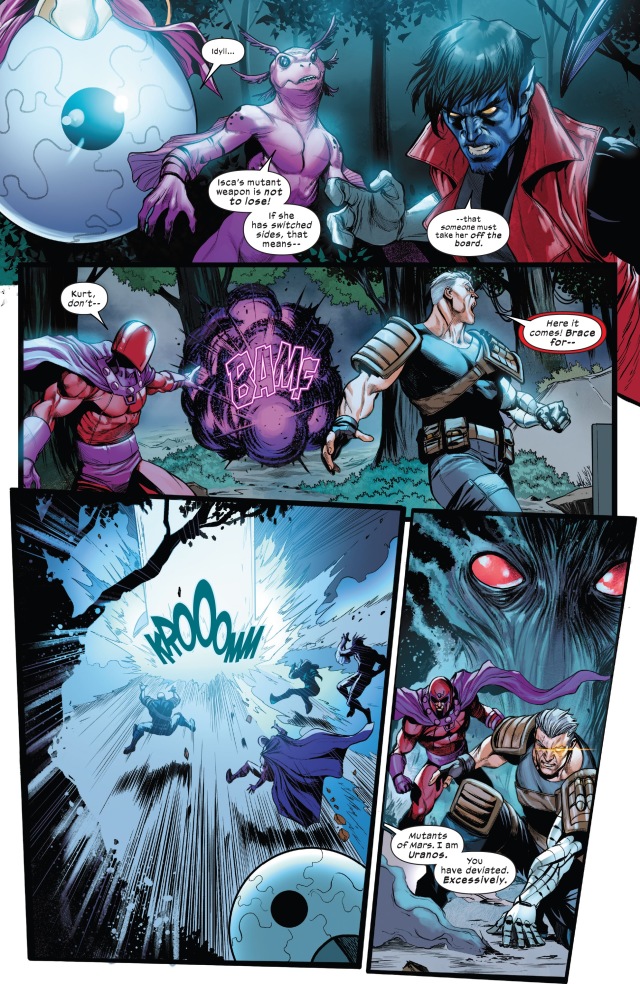所幸,在萬磁王剛剛摧毀了自己的最後一份備份後他沒有真的馬上死去,而是狠狠帥了一把;烏拉諾斯開外掛恐怖的程度大家相信都已經有目共睹;議會的九位成員(全員都是奧米加級的變種人)當中一位叛變、一位死亡、一位缺席、四位重傷,兩位暫時沒有大礙;議會的隱藏部分「夜晚之桌」似乎也即將在這個最黑暗的時刻浮出檯面。