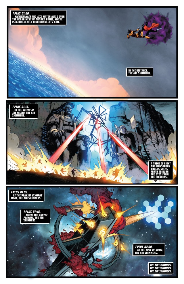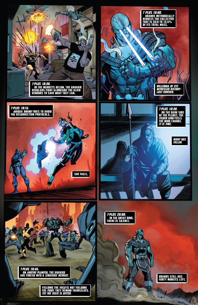 現在,除了烏拉諾斯本人與叛變的伊絲卡之外,他還帶了許多永恆族科技打造的自動化戰爭兵器來屠殺變種人。在整顆阿拉科星上,空氣隨之閃爍。