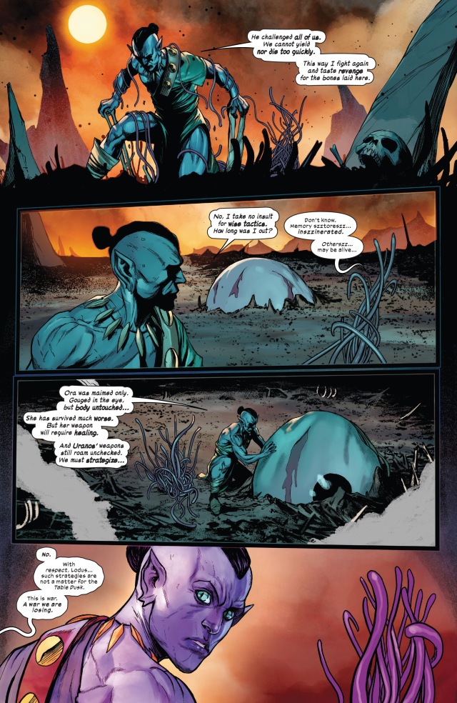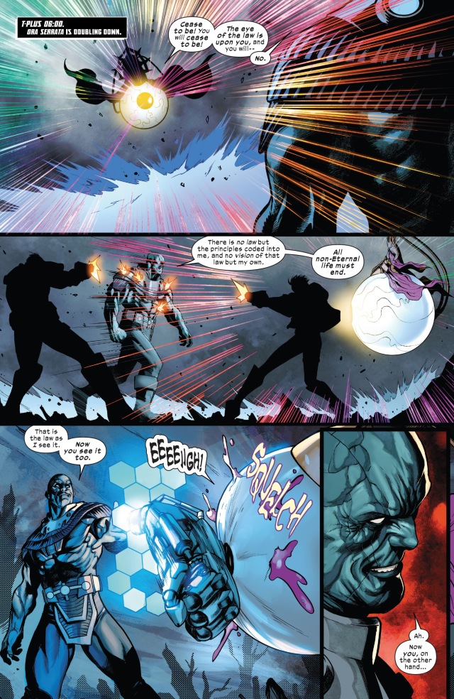 回到巨輪議會,Ora Serrata試圖用自己能夠弒神的變種能力直接把烏拉諾斯的存在抹消,卻沒有絲毫效果;也許是因為永恆族並不算是真的生命體,而是只要地球還存在就會無限復活的人偶所致吧。