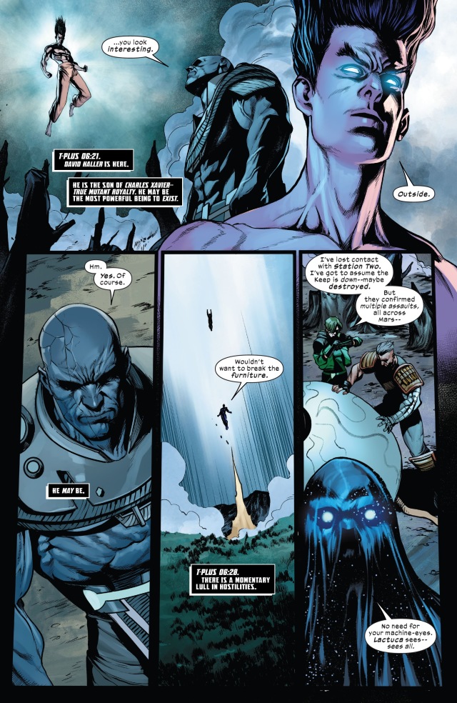 但是另一位挑戰者出現了——X教授的兒子,曾經成為變種人之神,具有多重人格的大群(Legion),很可能是古往今來最強者的他挺身挑戰烏拉諾斯。