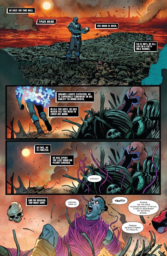 兩周前,漫威漫畫復仇者(Avengers)/X戰警(X-Men)/永恆族(Eternals)三方互動的大事件《審判日》(A.X.E.: Judgment Day)正式展開,而在第一期當中就發生了永恆族的烏拉諾斯(Uranos)隻身在一個小時內屠殺了變種人星球阿拉科(Arakko)上大多數人口的壯舉。