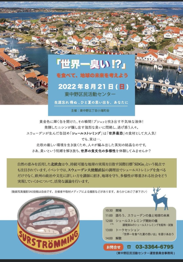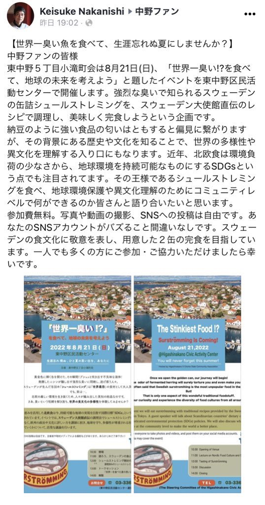 而這次的活動是在臉書社團「中野ファン」宣傳,希望透過這樣的方式理解不同國家文化的差異,並且宣揚地球環境保護的理念。預計將現場會開箱兩罐鯡魚罐頭,希望能在活動期間與參加者一起享用。