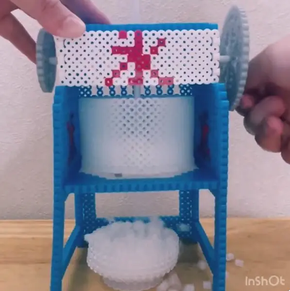 可以看到影片中,miwa 製作的刨冰機旁邊有著手動的齒輪,跟真實的刨冰機一樣可以轉動,轉動後就會掉出像是刨冰的拼豆零件,像是製作刨冰一樣趣味,也讓人驚豔居然拼豆能做出這樣的成品 !