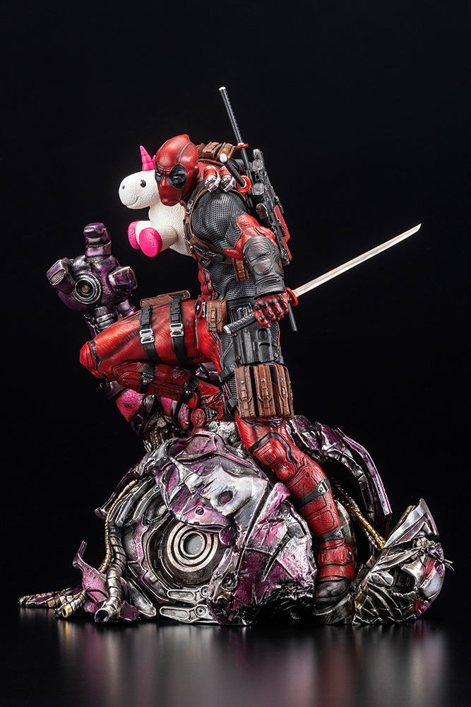 ▼ 以超級哨兵機器人寧錄(Nimrod)殘骸為題打造的底座表現出厚重金屬感與逼真機構細節,搭配拿著獨角獸的死侍,完全是戲謔感滿分的大勝利!