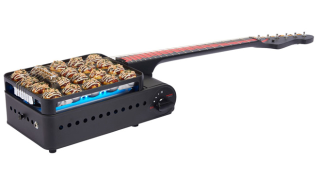 不過其實呢,這兩個吉他是分別放在雙方的大阪店面展示,而「機體」使用的是市面就有販售的章魚燒機「炎たこII」,只是將火焰的部分改造為藍色的LED燈,所以它根本就不會發熱,還是一把好好的吉他啦。當然了,這把吉他是可以正常演奏的。