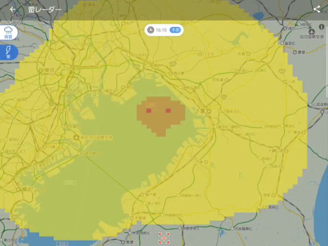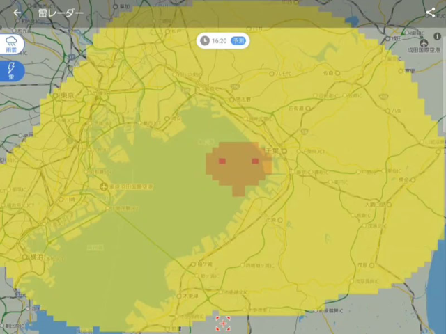 有網友稱那圖案很像《EVA》裡的「使徒」,也有人覺得那是「SKY PerfecTV!」的LOGO,還有人想到老牌遊戲《太空侵略者》的外星敵人,不過不管大家怎麼想,那顏色區分只是用來表示「落雷的可能性」,橘色表示該區域落雷機率很高,而兩點紅色區域則表示區域落雷「有點激烈」,所以這只是個天氣的圖示而已,不過網路就是如此,找點有趣的事情跟大家聊聊才比較愉快嘛XD
