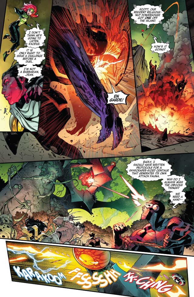 在克拉科上空,驚奇少女(Marvel Girl)和出谷(Exodus)這兩位奧米加級的心靈感應和念動力者正與The Hex的其中一位,Syne the Memotaur對戰;金鋼狼家族、獨眼龍(Cyclops)和其他人則與Rheaka Centaurus奮戰。就在此時,救兵來了。