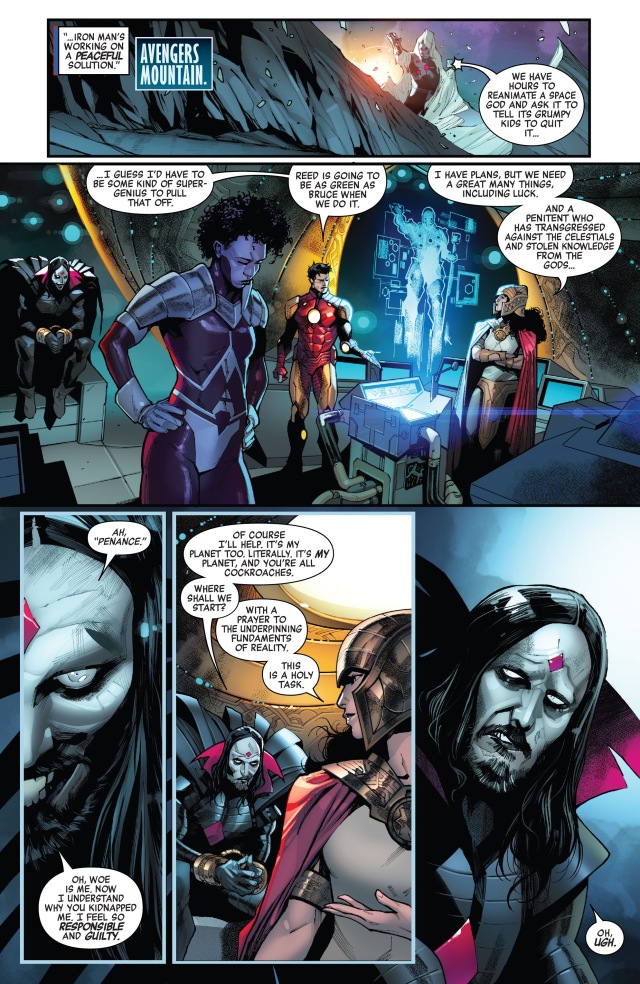 而在復仇者山當中,鋼鐵人(Iron Man)、凶兆先生(Mr. Sinister)、艾賈克(Ajak)與瑪卡瑞(Makkari)正在討論如何打造天神出來。果不其然他們綁架凶兆的原因是因為他過去曾經偷取過沉睡天神的力量,了解相關構造所致。出於對自己財產的保護,凶兆同意與他們合作拯救地球。