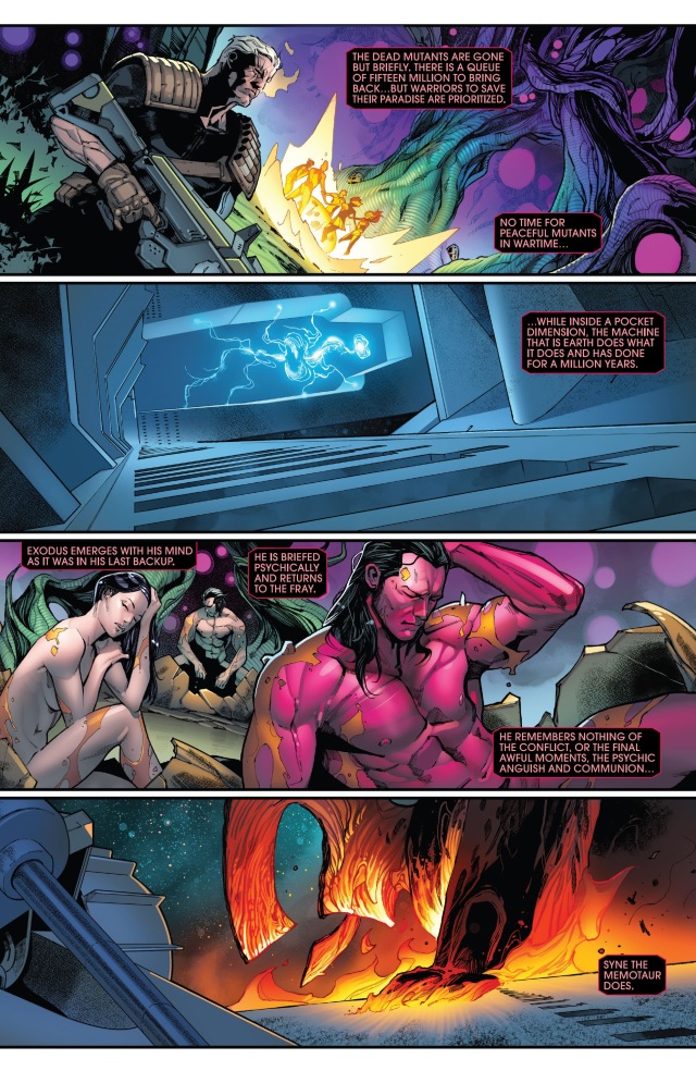 但是他們與The Hex之間的戰鬥產生了相當大的災害,在全世界各個海岸線都即將出現大量死傷。獨眼龍讓復仇者們離開去拯救人類,出谷卻趁機將這個行為包裝成是人類對於變種人的又一次拋棄與背叛。