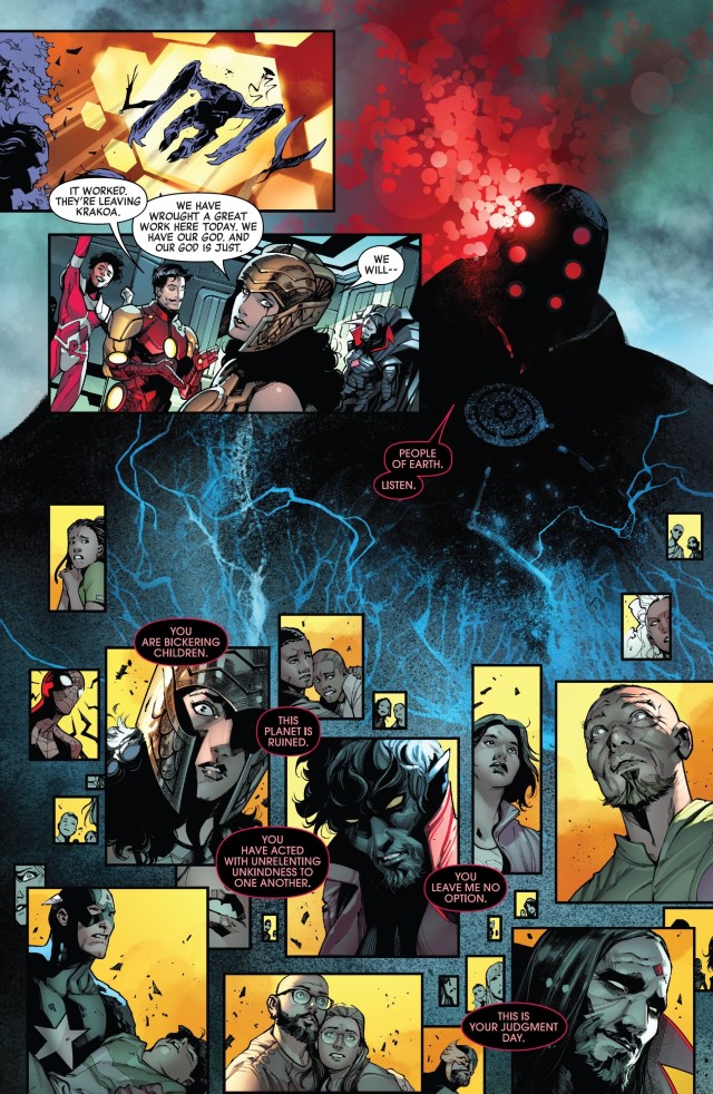 根據艾賈克的設計,這一位他們創造出來的天神將會較有「人性」,更為貼近他們的想法。順帶一提,鋼鐵人和凶兆先生對彼此噴的垃圾話——凶兆竊取沉睡天神的力量、東尼發現自己是領養的——都是本書作者Kieron Gillen在約十年前寫下的情節。