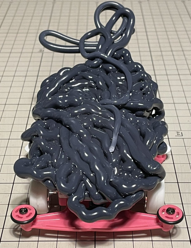 在這一堆看似麵條般的東西,通通都是將組裝模型廢料再經過加熱熔解後所製成的商品,這個本意也是為了推廣環保理念打造而成,希望可以透過這種方法讓廢料可以轉生為不同的樣貌,宣導循環再利用的思維。