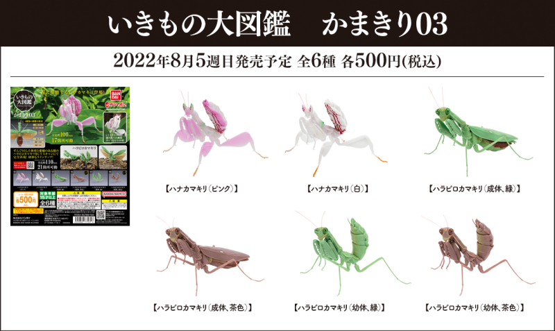 日本萬代玩具公司轉蛋事業部 GASHAPON 旗下高人氣的「昆蟲大圖鑑」超擬真無殼環保轉蛋,在先前的「螳螂」、「螳螂02」後,這次又將推出第二彈的「螳螂03(かまきり03)」轉蛋,更多精彩的螳螂追加登場!每轉參考售價為 500 日圓,預計將於 2022 年 08 月第五週開轉!
