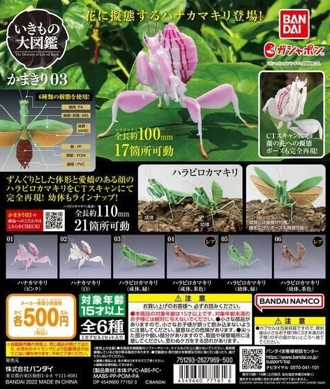 「GASHAPON 螳螂03 轉蛋」,由日本箕面公園昆蟲館專業協力開發製作,採用 X 光線 CT 掃描徹底還原標本的造型,本次收錄有「蘭花螳螂 粉紅色」、「蘭花螳螂 白色」、「寬腹螳螂 成體 綠色/深棕色」、「寬腹螳螂 幼體 綠色/深棕色」六款。全長約 10 公分的大尺寸,逼真將身體結構真實再現,完整重現包含身體形狀、細長的觸角、鐮刀狀的捕足等生物構造,以透明材質呈現前後翅細節。並透過可動關節與內部活動機構,全身達 17 處可動設計,可以還原螳螂捕食、展翅等生動擬真的姿態!