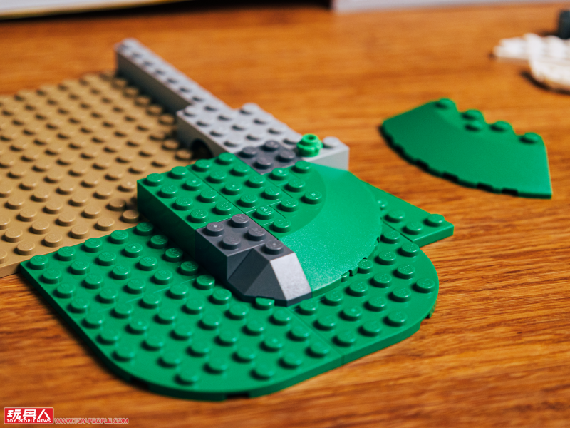 ▼ 常被用來作為底座線條修飾的 1/4 圓弧零件當初在「21322 梭魚灣海盜」當中是以沙色表現海灘,這次換個顏色就變成林地環境的視覺效果。