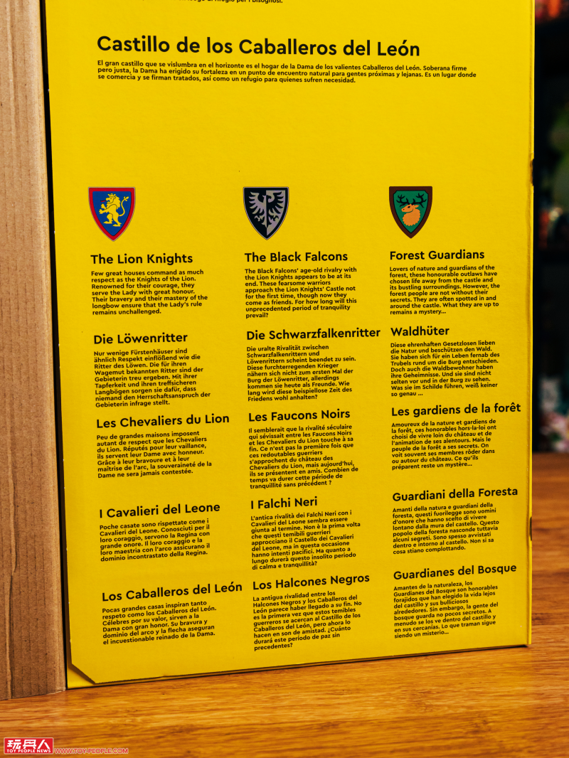 ▼ 由側邊拆開之後可以發現樂高以五種語言寫下了這款「獅子騎的城堡」與三方陣營-獅子騎士(The Lion Knights)、黑鷹軍(The Black Falcons)、森林守護者(Forest Guardians)的介紹。