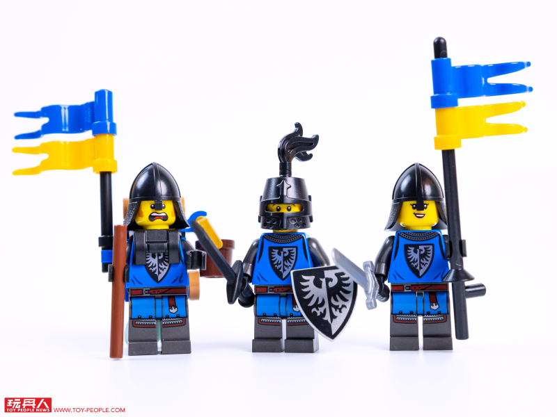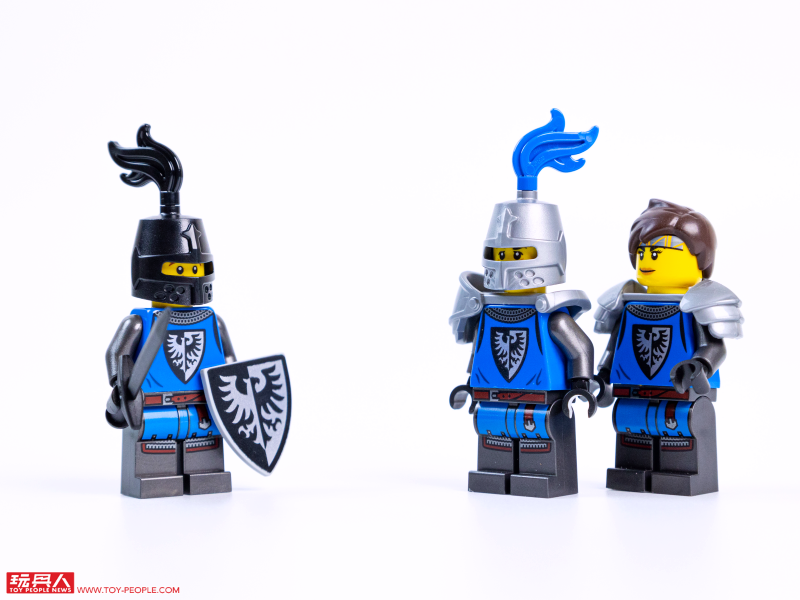 ▼ 接著是來訪的黑鷹軍,同樣也是三位,值得一提的是中間那位騎士穿戴的頭盔採用黑色印刷,不同於先前在「21325 中世紀鐵匠小屋」士兵的銀色。