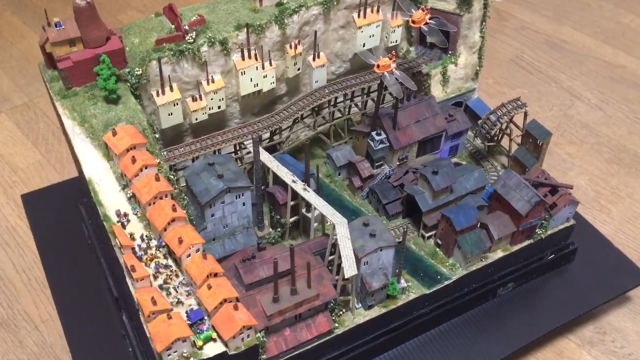 石川宜明選擇《天空之城》的城鎮來打造,參考了原作中對於城鎮中的場景設計,透過自己的巧手還原出來,可以在各處都看到屬於作品世界觀的細節。加入可行駛的電車,搭配經典的 BGM,彷彿電影中的場景浮現在腦海中。