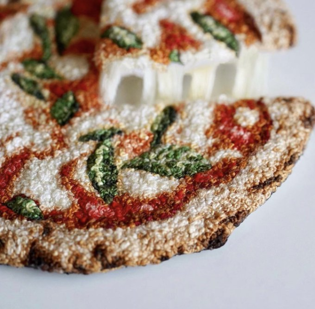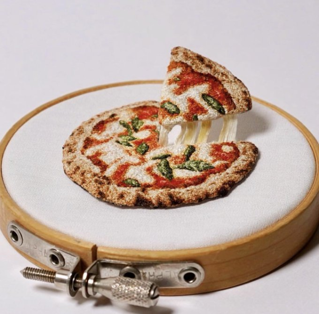 下方的手工刺繡披薩,是推主使用法式線結「結粒繡」製作而成,以一條條線透過親手製作而成,彷彿像圖畫般的效果,也是推主最自豪的地方。