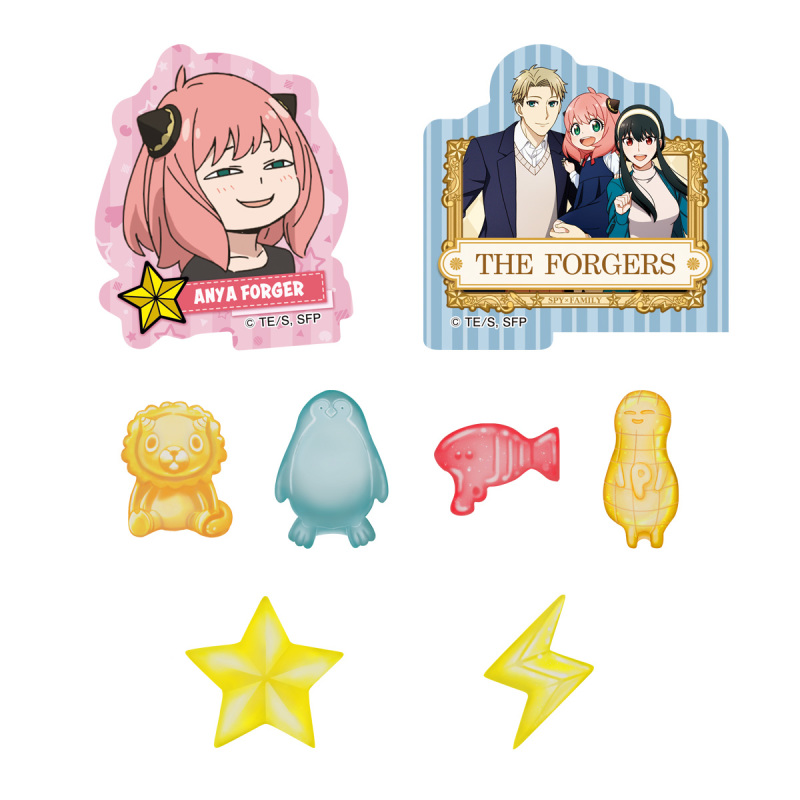 「SPY×FAMILY軟糖」,將劇中可愛的奇美拉獅子玩偶、企鵝與花生等設計為綜合水果造型軟糖,並附有一共 15 種的貼紙,在享用軟糖的同時還可以收集到安妮亞的各種精彩顏藝、全家福和同學等角色貼紙!另外,還有稀有的伊甸學院星星與閃電軟糖,收集8顆星星成為獎學生吧!!!