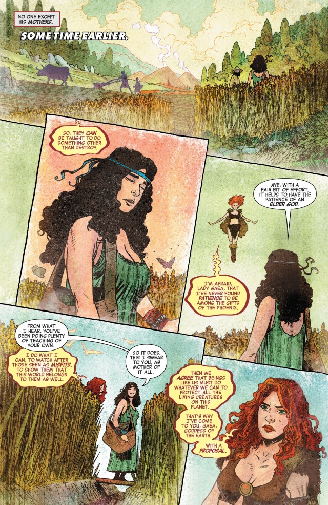 但是蓋婭的這個孩子從何而來?原來是鳳凰在稍早前回到了地球以尋找蓋婭,並對祂提出一項提議:請祂答應奧丁的求歡,與祂生下能夠守護地球、屬於地球、在乎地球的新神。因為火髮自己身具鳳凰之力,隨時可能會危害到地球本身,祂害怕自己並不適合這項任務,所以只有在乎這個世界的蓋婭適合。