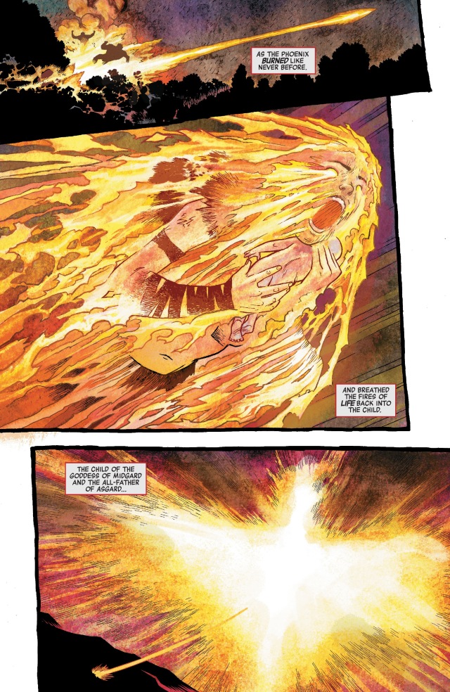 她帶著孩子飛入天空,讓他沐浴在鳳凰之力的火焰當中。這個嬰孩逐漸恢復生氣,而祂的第一口呼吸便是烈焰。