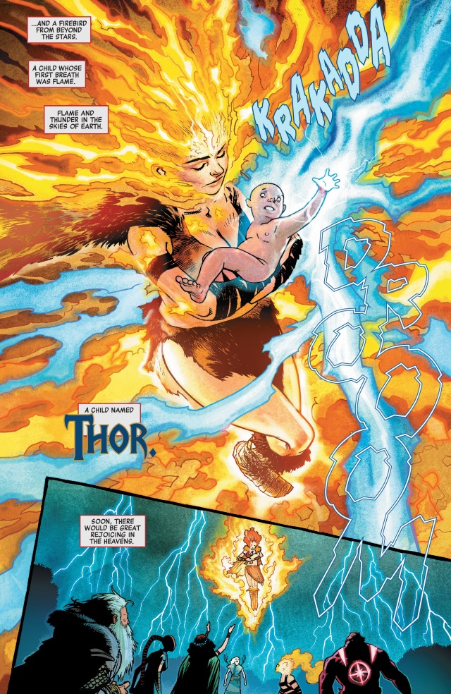 因此,這個孩子成為了阿斯嘉天父、地球古神與鳳凰之力的孩子,身上帶有雷霆與烈焰——祂就是索爾,雷霆之神。