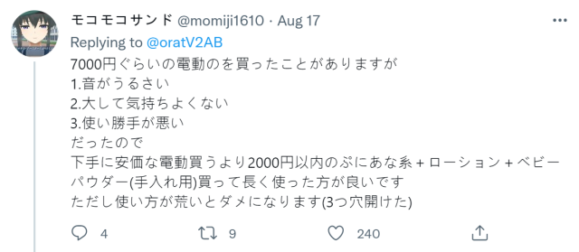 ▼ 有網友表示買過 7000 日圓的電動器材,不只很吵還很不好用,建議搭配潤滑液與嬰兒爽身粉使用,體驗會比較好。
