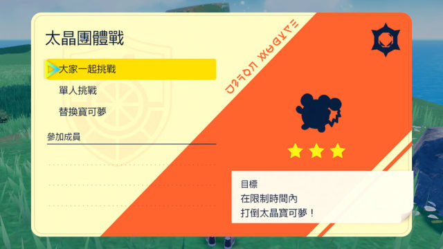「太晶團體戰」是在有限時間內,必須由四位玩家共同挑戰太晶化的也生寶可夢,只要碰觸到發光結晶,就能夠進行「太晶團體戰」的挑戰。而結晶外觀就如同寶石,其顏色也與太晶化寶可夢的屬性一致,再加上結晶本身也會從天空發射出閃耀光柱,因此玩家在遠處就能夠發現了。