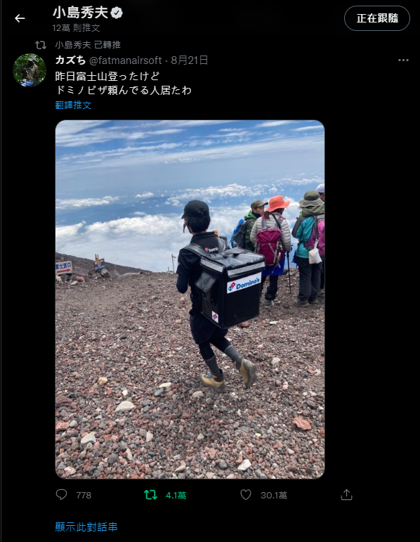 值得一提的是,這起富士山外送也因為意外地引起電玩製作人小島秀夫的注意跟轉發,這也讓不少網友開玩笑直呼,顯然這就是《死亡擱淺》(Death Stranding)真人版了吧XD