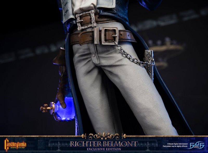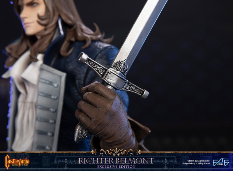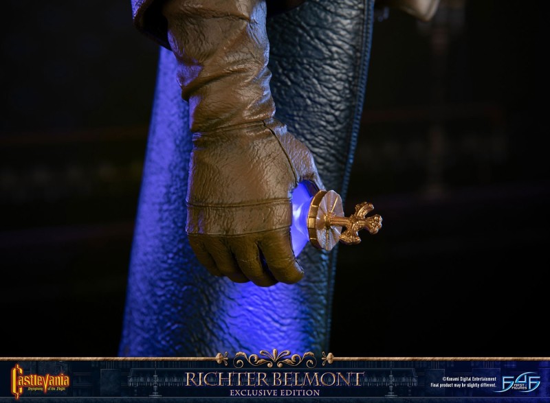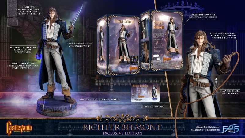 這款由Fisrt 4 Figures所推出的里希達・貝爾蒙多立體人形雕像,全高超過50公分,以當時遊戲的彩圖造型為基礎,將其完整還原出來,留著長髮的里希達,手持著吸血鬼一族傳下來的鞭子,帥氣的站立著,身穿藍色長風衣外套,白色內襯與灰長褲搭配靴子,看起來相當威風凜凜。本款商品同樣有豪華版,內容差異在於豪華版可以將手持鞭子取下,讓里希達改為手持短劍與經典輔助武器「聖水」!透過內崁LED的幫忙,聖水還可以散發光芒!