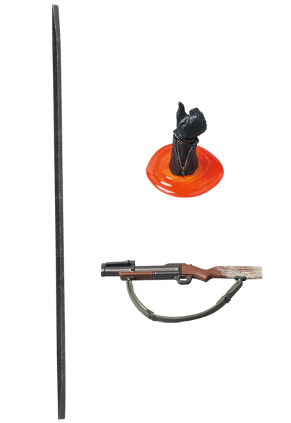 「MAFEX T-800 (T2: BATTLE DAMAGE Ver.)」可動人偶,尺寸約高 16 公分,以 T-800 在《魔鬼終結者2》從反派變成英雄、最後大戰的戰損造型為基礎,再現一身俐落皮衣的穿搭,並逼真重現身體各部位因激烈戰鬥而破損、受傷的模樣!頭部和胸部的表皮遭到毀損,露出內金屬內骨骼,而右臂則是完全斷裂、暴露機械結構。搭配T-1000的霰彈槍等武器,整體超級帥氣!另外還有最後一幕超經典的「豎起大拇指」配件,I’ll be back!