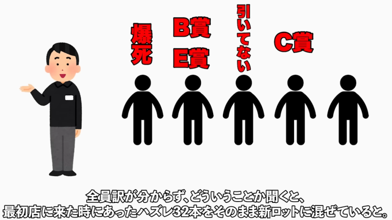 當晚開賣時大阪日本橋門市限制每人只能買 20 抽,現場共有 5 人排隊抽獎,除了有一人放棄沒抽外每個人都是抽滿 20 支,當第三人抽完時整套商品理應剩下 20 支籤,但現場卻發現有整整 52 支籤,當場抓包店家惡劣的混籤行為,進一步追問店家才的得知他們將上一套抽剩的小獎混入新商品中藉此魚目混珠。經過高層調查後,他們甚至發現連 LASTONE 賞都被員工私自侵佔並透過轉賣不當得利,行之有年。這樣的做法在萬代南夢宮的販售規章中是不被允許的,對消費者來說更是與實際中獎機率不符的詐欺行為。