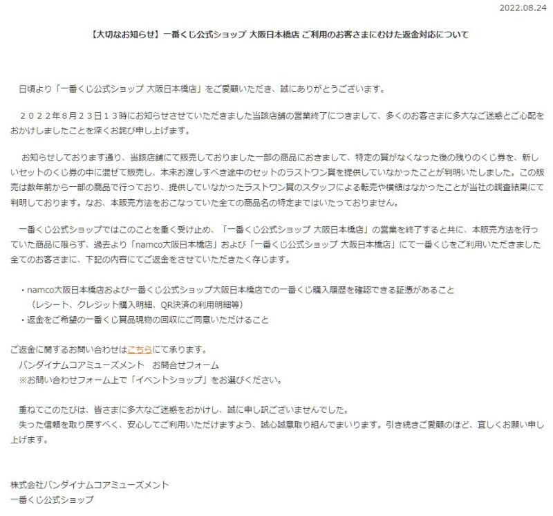 日本萬代南夢宮於 08 月 23 日晚間公告聲明,由官方直營的『一番賞』官方專賣店大阪日本橋門市因被舉發詐欺販售行為且經查證屬實,為維護商譽即日起終止該店鋪營業,並向該店顧客表達歉意。