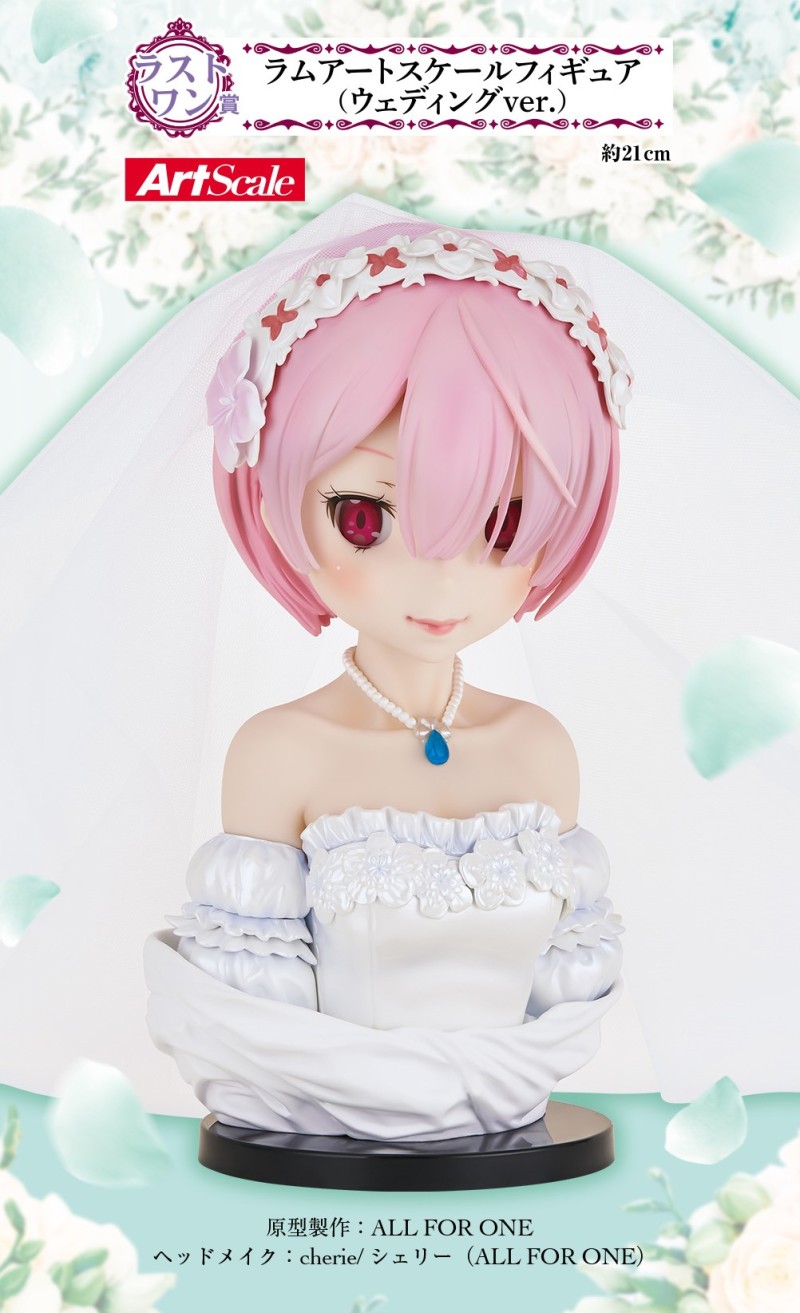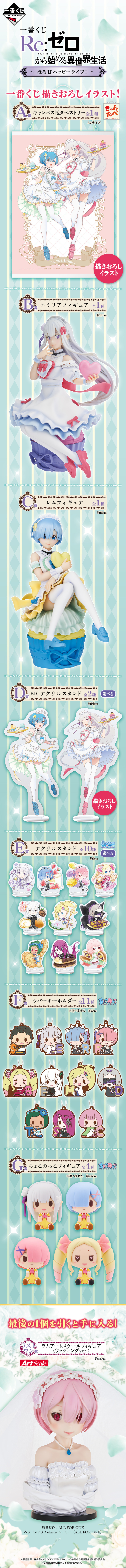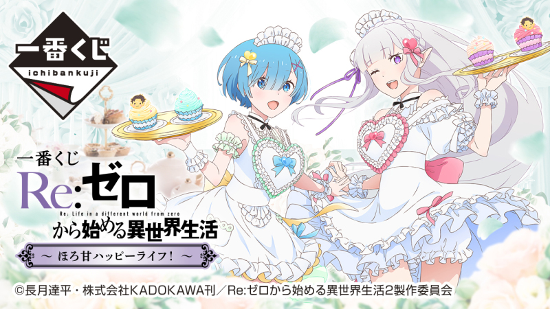 「一番賞 Re:從零開始的異世界生活 ~微甜的幸福生活~」以劇中人氣女角穿上心型圍裙、散發香甜氛圍的甜點廚師造型為主題,推出 A賞 A2尺寸帆布掛毯、 B 賞 愛蜜莉雅角色模型、 C 賞 雷姆角色模型,以及包含BIG壓克力立牌、壓克力立牌和橡膠吊飾、 CHOKONOKKO Q版角色模型、最後賞的婚紗 ArtScale 拉姆 1/3比例胸像(最後賞ver.)等豐富的獎品!