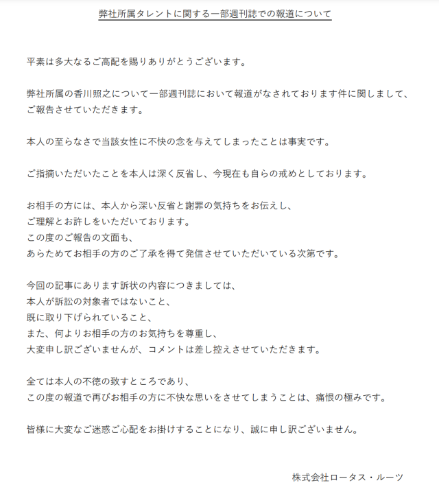 其實該性騷擾風波是源於香川照之與友人 2019 年 7 月深夜光顧該酒店時,對店內一名女公關上下其手,行為猥褻,還造成受害女性罹患PTSD(創傷後壓力症候群)。但她提起訴訟的對象是沒有出來阻擋的酒店媽媽桑,並非香川造之本人,後來於 2021 年撤告。雖然香川本人並非訴訟當事人,但承認自己行為不檢,也很愧疚新聞報導造成受害女子二度傷害,經紀公司事先獲得對方許可發表聲明,針對這次事件造成社會觀感不佳十分抱歉。